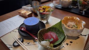 |湯葉茶碗蒸し / 芹と壬生菜 / グリーンサラダ / 旬の造り